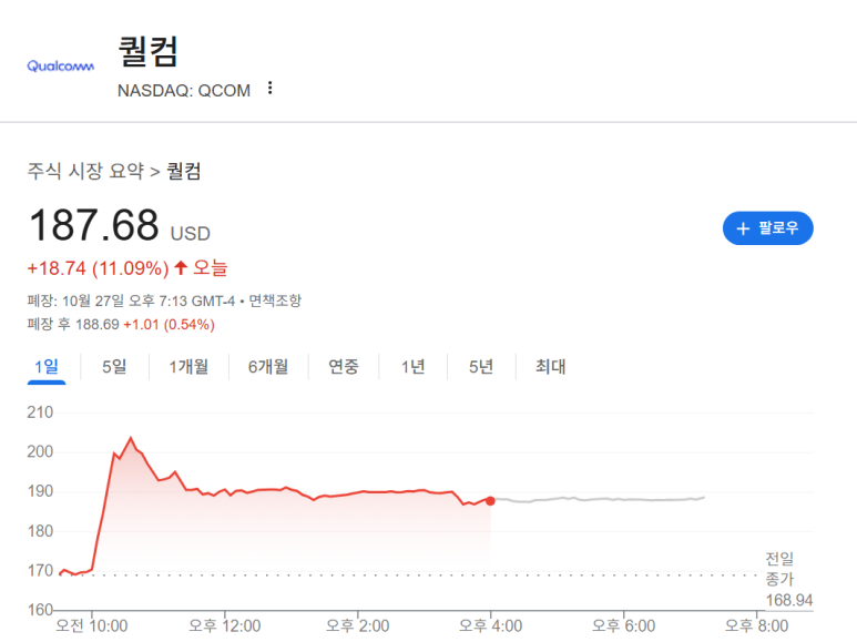 퀄컴의 주가가 20% 가까이 급등하다가 +11%로 장을 마감했습니다.
