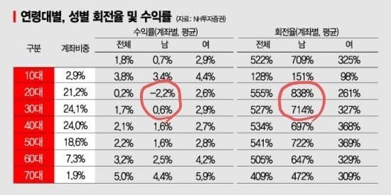 표를 보시면 아시겠지만 20대 남성의 수익률은 -2.2% 회전률은 838%에 육박합니다.